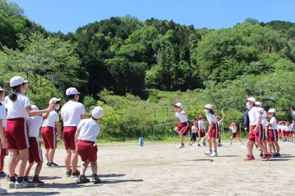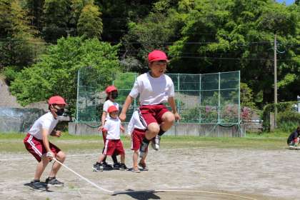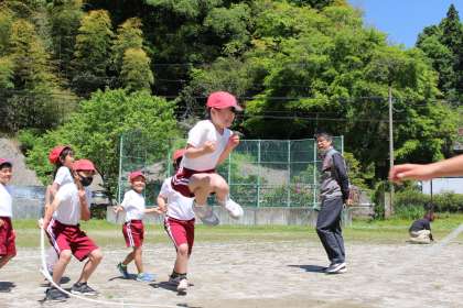入退場を含む「8の字跳び」の練習をしました。グランドでの初めての「8の字跳び」。子どもたちの競技への取組に魂が入り始めています。ここまでの練習では、大接戦です!