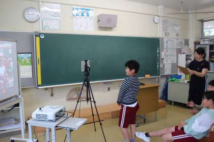 先生から野外学習班の発表がありました。名前が呼ばれると、一人一人が返事をしました。タブレットの前まで出てきて「お願いします」とあいさつしました。