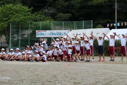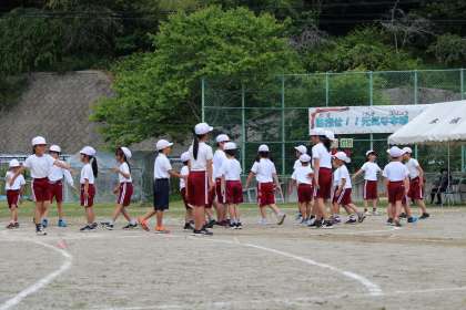 本城小の伝統として長く行われている「打ちはやし」のお披露目に加え、何か運動会に向けて全員で心を燃やしていけるものを、と集団行動に挑戦しました。