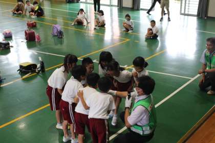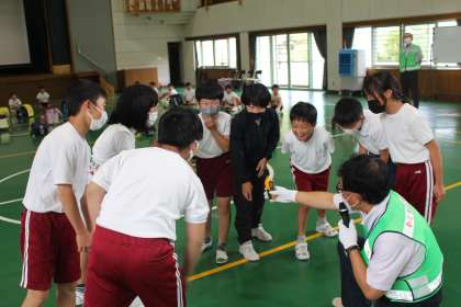豊田市役所防犯課の地域安全指導員の方々から、防犯について、楽しく、わかりやすく教えていただきました。声量を測定する活動をはじめ、体を動かしながら学ぶことで子どもたちは一生懸命に取り組みました。
