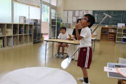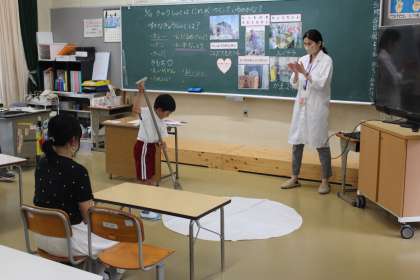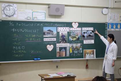 北部給食センターから栄養教諭の●●先生に来ていただき、子どもたちはお母さんといっしょに「給食はだれがつくっているのかな?」について学びました。