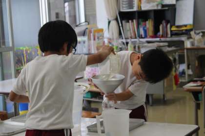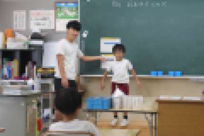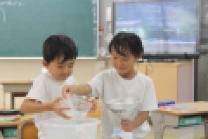 1年算数科「おおきさくらべ」 公開日 2023/09/27 更新日 2023/09/27 各学年から 入れ物のかさを比べる方法をみんなで考える授業。水を使って考えるという条件のもとで、子どもたちは一生懸命によい方法を模索していました。また、実験から分かったことを順序だてて説明するという、表現力を身に付けるための発表の場も設けられた授業でした。
