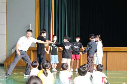 「相手意識が高まり、子ども同士がつながる」ことを目指し、「協力」と「コミュニケーション」をキーワードに行っている全校集会。今回の活動テーマは、「より良い方法をみんなで模索する」です。手をつないで丸くなった各グループの体を通してフラフープを一周させるという競技です。いかに短時間で一周させるかに試行錯誤しながら、どのグループもがんばりました。