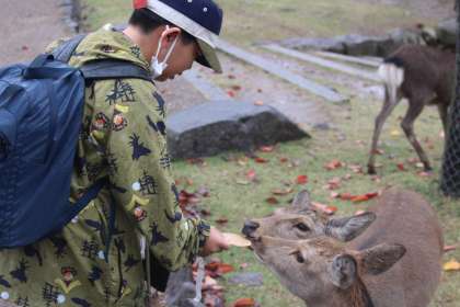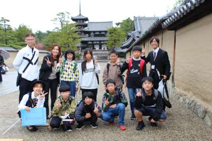 2日目は奈良へ!大きな大仏様を見学。門番のシカがいっぱい。子どもたちは人気者!?いや目的はせんべいだな。最後は、きれいな五重塔をバックに「はい、チーズ!」。