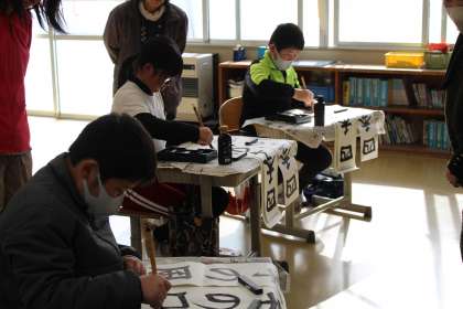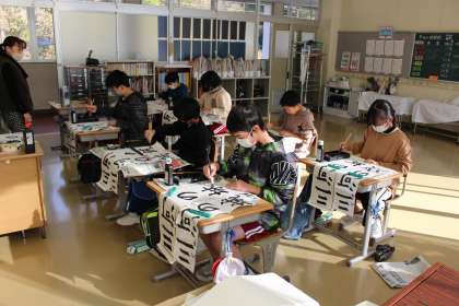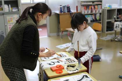 毎年、●●先生を講師にお迎えし、書き初め大会本番に向けて、児童一人一人にアドバイスをいただいています。どの学年の子どもたちも、アドバイスに耳を傾け、しっかりと練習に向き合っている様子が見られ、よい雰囲気の中での取組に見られました。