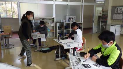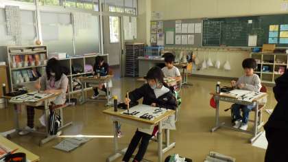 11月29日と、12月14日の2回、書き初め指導補助ボランティアの先生に来ていただき、書き初め練習をしました。3〜6年生は、それぞれ文字の形で気を付けることや筆使いのポイントを教えてもらいながら、真剣に練習に取り組みました。教えていただいたことに気を付けながら、書き初め大会に向けて練習します。