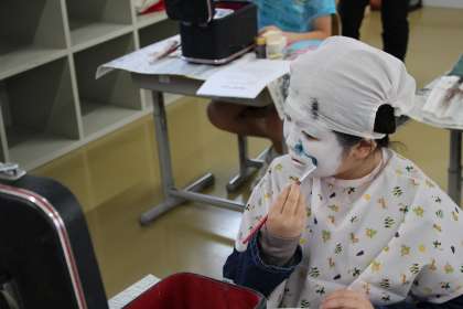 小原歌舞伎に親しむ 〜3・4年 隈取体験〜 公開日 2024/01/23 更新日 2024/01/23 特色ある学校づくり推進事業 先日の5・6年生「所作体験」、1・2年生「お面作り」に引き続き、3・4年生で「隈取体験」を行いました。始めは不安そうな表情をのぞかせる児童たちでしたが、鏡で地色に塗られた自分の顔を見ながら、筆で線を描き、化粧を重ねるその姿は真剣そのもので、一人一人が勇ましい表情に仕上げました。