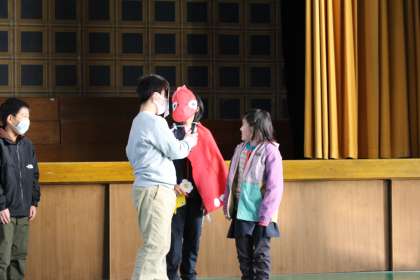 今月の主役へのインタビューは、ピグミンが行いました。でも、ピグミンの言葉は私たちには全く理解できません。そんな中で、今日は、6年生の一人が通訳をしてくれるという驚きの場面がありました。ピグミン語がわかるなんて、凄すぎる!