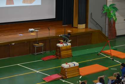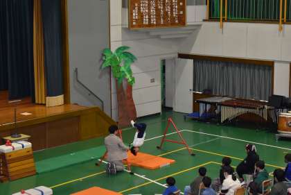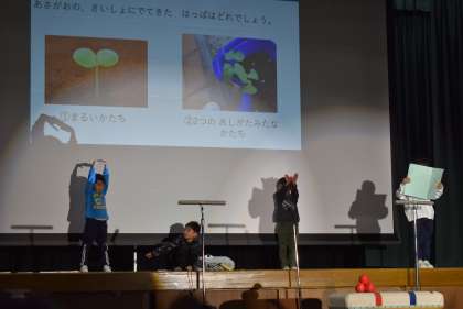 城山学習発表会 1年 公開日 2024/02/21 更新日 2024/02/21 学校行事 『ムキムキ えがお〜あさがおとぼくたちおせいちょう〜』 アサガオを育ててわかったこと、国語の授業で学習したことや詩の暗唱などを発表しました できるようになったことでは、跳び箱や鉄棒の実演もしました。