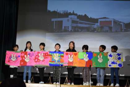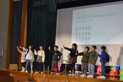城山学習発表会 2年生 公開日 2024/02/21 更新日 2024/02/21 学校行事 『さがせ!小原のピースポイント』 町探検で巡った8か所で見つけた小原のいいところを「ピースポイント」として、劇やクイズで発表しました。