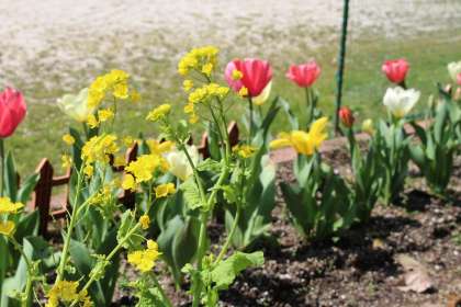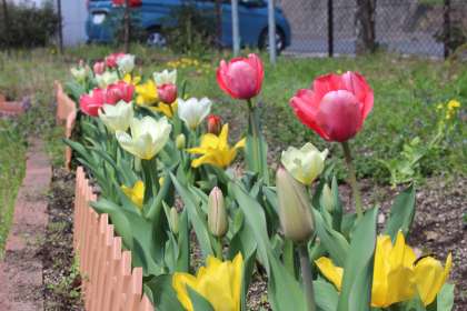 今年は全体的に暖冬とは言うものの、気まぐれな冬です。暖かくなったと思ったら、突然ひんやりと冬の空気に舞い戻る。自然界の植物も動物もきっと戸惑いを隠せないのではないでしょうか。本校正門横の花壇に植えた植物も、なんとなく困り感が出ているように見てとれます。ここにきて、ようやくチューリップも菜の花もきれいな花を咲かせています。