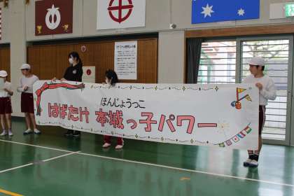 スローガンの募集から全児童による投票まで、6年生が中心となって取組を進めてきました。今週水曜日からの運動会練習開始に先立って、スローガンが発表されました。「はばたけ 本城っ子パワー」始まります。