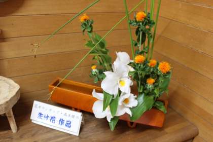 本城小学校の玄関は、いつもお花で彩られています。花ボランティアの●●さんに、おのおのの季節に自然の中で咲く花をアレンジして、飾っていただいています。