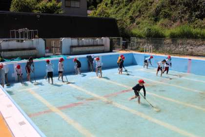 みんなが楽しみにしているプール。その前に必ずやらなければならないこと。それがプール掃除です。例年は5・6年生の上級生がその役割を担ってきました。しかし、今年からは上級生がとても少なく人手が足りません。3・4年生もそして先生たちも5・6年生といっしょになって、みんなでプールを磨きました。また、更衣室とトイレをきれいにするために、1・2年生も力になってくれました。