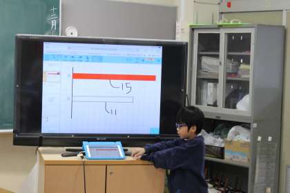 本時は、引き算の計算式の活用をめざして、テープ図による見える化を図り、その考え方を深める機会とした。子どもたちは、タブレットを使って、スカイメニューによるテープ図で、文章題による問いの情報を正しくつかんでいく様子が見られた。