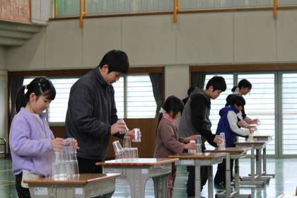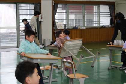 1年生の出し物「はやい者勝ちゲーム」。目の前に並べられたプラスチックコップ。だれが一番早く一つにまとめられるかな? 1年生がとにかくはやかった。おまけに、机の準備もはやかった。その姿がかわいかった。