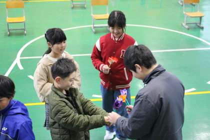 3年生の出し物「爆弾ゲーム」。爆発してしまった児童は、その場で6年生に向けて即興でメッセージを言うというお題。すばらしい仕掛けでした!