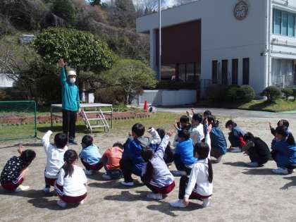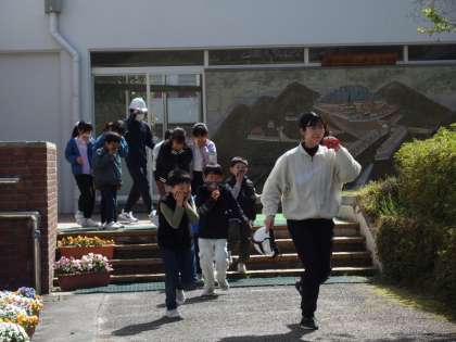 子どもたちは、放送が入ると指示を静かに聞き、鼻と口をおさえて煙を吸い込まないようにしながら、素早く運動場へ避難することができました。