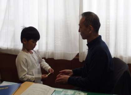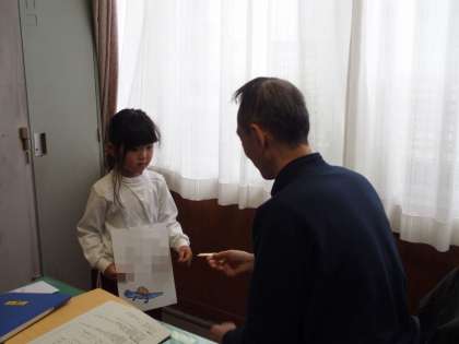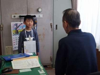 4/16 学習の様子(1年国語) 公開日 2025/04/16 更新日 2025/04/16 各学年から 1年生が、国語「よろしくね」の単元で、先生たちに自己紹介をしていました。 写真は、校長先生に自己紹介をしている様子です(一部加工してあります)。 全員が名札をつけ、自分の名前と好きなものをはっきりと伝えることができました。 自己紹介をしたしるしに、シールを名札に貼ってもらいました。
