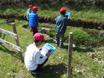 3・4年生は、理科の「季節と生物」の単元で、学校内の「春」を探していました。