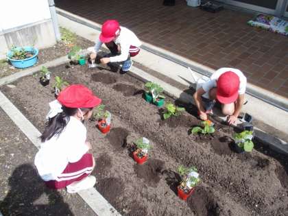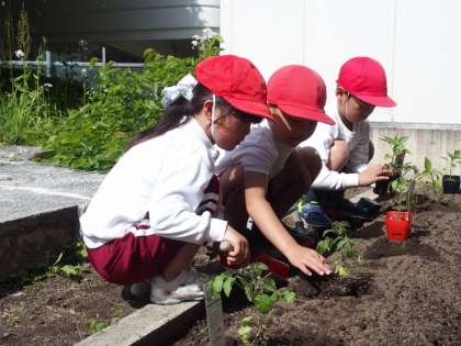 5月8日(木)3時間目に、1年生が生活科(複式カリキュラム)で、野菜の苗を植えていました。