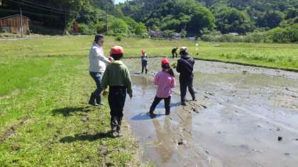 5月13日(火)、5・6年生が総合的な学習の一環として田植えを行いました。