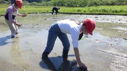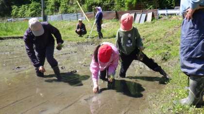 地域の皆さんのご指導・ご協力のもと、自分で籾まきをして育った苗を、泥だらけになりながらていねいに植えていきました。