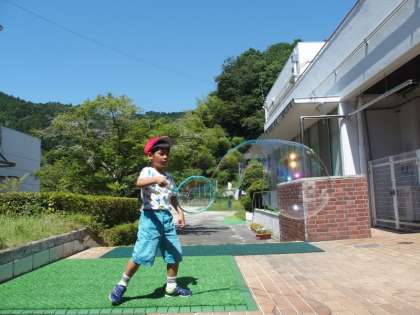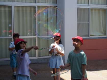 先生が作ってくださったシャボン液に、ハンガーで作った輪っかやストローを使い、いろいろなシャボン玉を作って楽しみました。
