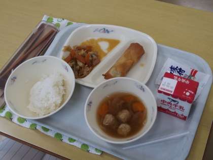 今日の給食は、肉団子のスープ、はるまき、野菜のみそ炒め、乾燥小魚、ご飯、牛乳です。