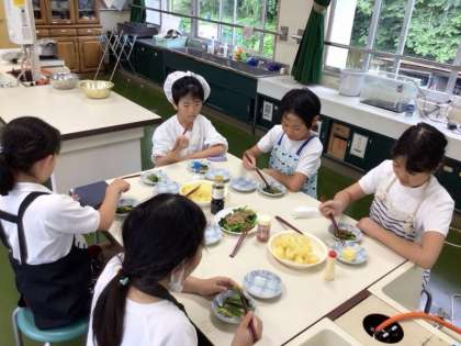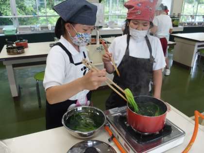 5・6年生は、家庭科「ゆでる調理でおいしさ発見」の単元で、小松菜のおひたしと、ジャガイモの「ゆでいも」の調理実習を行いました。