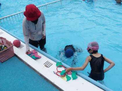 低学年は輪くぐりをしたり、宝探しをしたりしながら、水に親しんでいました。