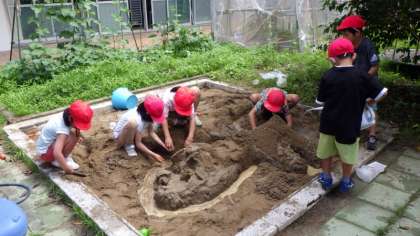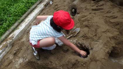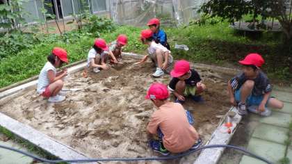 6/27 学習の様子(1・2年図工) 公開日 2025/06/27 更新日 2025/06/27 各学年から 1・2年生は、図工「すなやつちとなかよし」の単元で、中庭にある砂場で砂遊びを行っていました。 初めは山やトンネルを作っていましたが、そのうち「水を流してみよう」ということになり、川ができあがりました。 みんなの作品をつなげて、砂場全体を使ったダイナミックな作品が完成しました。
