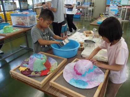 7/7 和紙制作指導(2年) 公開日 2025/07/08 更新日 2025/07/08 特色ある学校づくり推進事業 今日は2年生が和紙作家の二村さんに指導をいただきながら、和紙作品の制作に取り組みました。 二村さんからは、色使いや飾りを上手につけるコツなどを教えていただきました。 みんな一生懸命取り組み、作品を仕上げることができました。