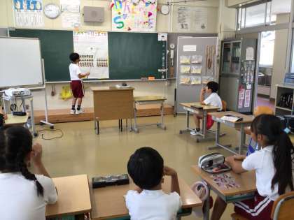 3・4年生は、理科の授業で、夏休みに科学研究を行った児童の発表をしていました。