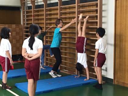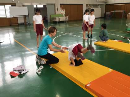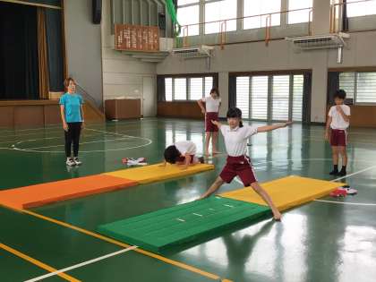 9/4 学習の様子(5・6年体育) 公開日 2025/09/04 更新日 2025/09/04 各学年から 5・6年生は、体育でマット運動に取り組んでいました。 今回は、後転をうまくできるようにすることが目標です。 まず、前時までの復習として、肋木での倒立からの前転や、開脚前転などを行いました。 続いて後転にチャレンジですが、なかなかまっすぐに転がることができません。 体力向上補助指導員の先生の、助言や補助をいただきながら練習を行い、だんだんスムーズに後転ができるようになりました。