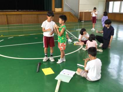 体育館と音楽室に集まり、かけ声や笛、太鼓の練習をしました。