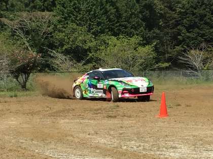 続いて、運動場で、実際にラリーカーが走っているところを見たり、学校代表の先生が試乗したりして、迫力ある走りを実感することができました。
