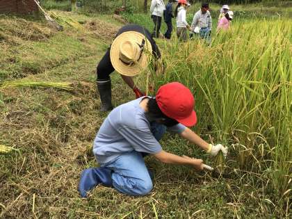 稲の一部は学校に持ち帰り、昔ながらの方法で脱穀、籾摺りなどをする予定です。