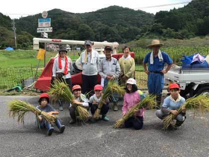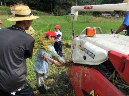 地域の方にも大勢お手伝いをしていただき、機械の力も借りながら稲を刈ることができました。