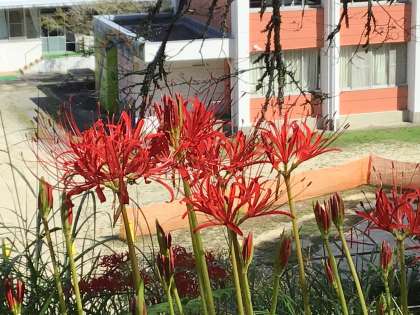 本日、学校の南側にある小山の斜面に、ヒガンバナが咲いているのを見つけました。