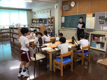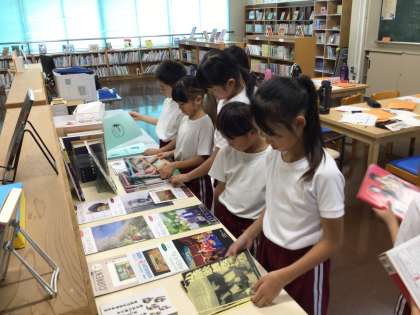 3・4年生が、総合的な学習の時間で、図書室で授業をしていました。