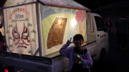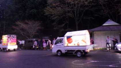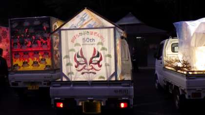 各団体が工夫を凝らした行燈を載せた軽トラが、時間になると次々と出発していきました。