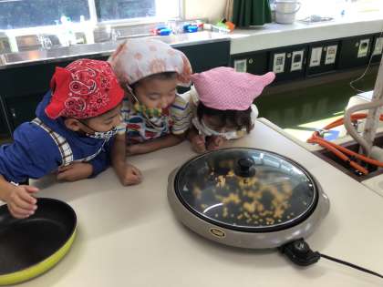 1年生が生活科で、先日収穫したトウモロコシ(ポップコーン)を使って、ポップコーン作りをしていました。