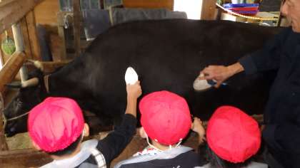 10/22 校外学習(1年)その3 公開日 2025/10/22 更新日 2025/10/22 各学年から 最後に、牛舎で牛の世話の体験をさせていただきました。 係の方から、牛の様子や餌についてのお話などを聞き、実際にブラッシングや餌やりの体験をしました。 牛は毎日、餌を25キロくらい食べると聞き、びっくりしました。 どの体験もとても楽しく、時間がすぐに過ぎてしまいました。 とても充実した1日でした。