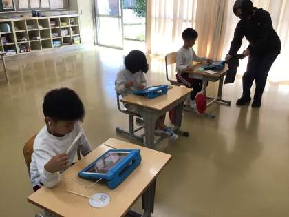 今日の4時間目に、1年生が、道慈小とのオンライン学習を行いました。