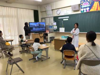 4時間目に1年生が、栄養教諭の先生を招いて、保護者の方と一緒に食に関する授業を行いました。