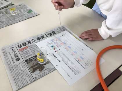 今回は、食塩水、炭酸水、アンモニア水、塩酸、石灰水の5種類の水溶液が、酸性か、中性か、アルカリ性かを、リトマス紙を使って調べていました。