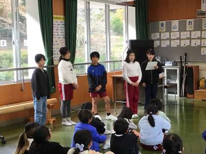 11/27 小原四季桜まつり その1 公開日 2025/11/27 更新日 2025/11/27 特色ある学校づくり推進事業 いよいよ今日は四季桜まつりでの打ちはやし披露の日です。 学校を出発する前に、全員で集まり、5・6年生が中心となって、「がんばろう集会」を行いました。 みんなの気持ちがひとつになるように、5・6年生が一人一人にお守りを作ってくれました。 最後に、全員でかけ声をかけて気合いを入れました。 がんばりましょう!