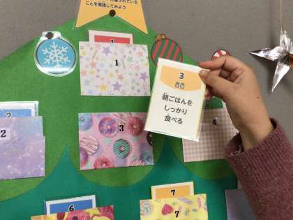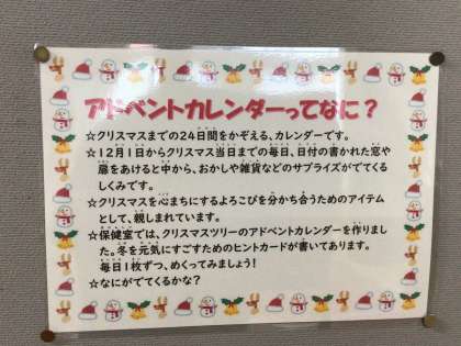 12/3 アドベントカレンダー 公開日 2025/12/03 更新日 2025/12/03 特別活動 保健室前の掲示板に、アドベントカレンダーが掲示されています。 みんなが冬休みまで元気に過ごせるように、毎日一つずつのアドバイスが書かれています。 養護教諭の先生が、すこやか委員会の子どもたちと一緒に作ってくださいました。 インフルエンザも流行ってきているようです。 健康に気をつけて毎日を過ごしましょう。