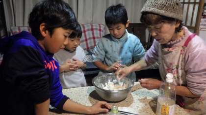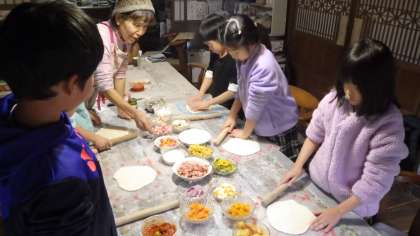 ここで、1年生3人と合流し、ピザ作りを行いました。